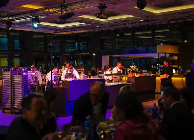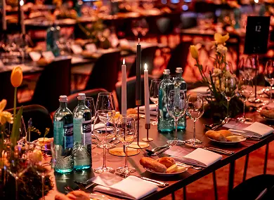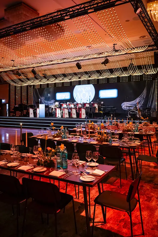 Der Ballsaal Potsdam ist Berlins größter säulenfreier Ballsaal und damit das architektonische Herzstück des Abends. Weite, Offenheit, perfekte Sichtachsen. Kein Pfeiler stört den Blick, kein Detail wirkt zufällig. 2023 vollständig modernisiert, ausgestattet mit neuester Veranstaltungstechnik und einer einzigartigen Lichtgestaltung, bietet der Raum ideale Bedingungen für große Inszenierungen. Kurze Wege zur Küche garantieren einen reibungslosen Ablauf zwischen Dinner und Programm. Durch flexible Trennwände lässt sich der Saal individuell anpassen. Beim VBKI Ball jedoch zeigte er sich in voller Größe. Das angrenzende Potsdam Foyer mit brasilianischem Rosé-Granit, großzügigen Garderobenflächen und separaten Sanitärbereichen ergänzte die Infrastruktur auf höchstem Niveau.